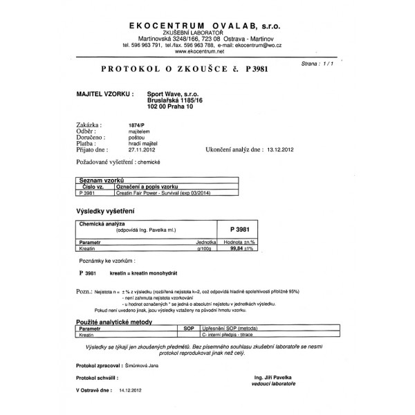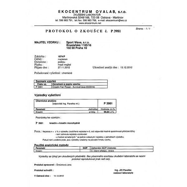 Creatin Fair Power vyrobený ve společnosti Survival je nejčistší formou mikronizovaného kreatinu. Samozřejmě, že bychom Vám mohli na obale napsat údaj 100 % jako ostatní výrobci, ale pak bychom se styděli za slovo "fair" v názvu našeho produktu. Nenajdete totiž na trhu kreatin monohydrát, který by obsahoval skutečných 100 % kreatinu. Nejlepší laboratorní rozbory ukáží maximálně hodnotu 99,5 %. A to je i výsledek, který má náš kreatin. Ten pro Vás pravidelně testujeme v nezávislých laboratořích, výsledky aktuálních rozborů najdete vždy na našich stránkách. Za kvalitu našeho kreatinu dám s klidem ruku do ohně. Až ho vyzkoušíte, věřím, že byste ji tam dali i Vy se mnou.
