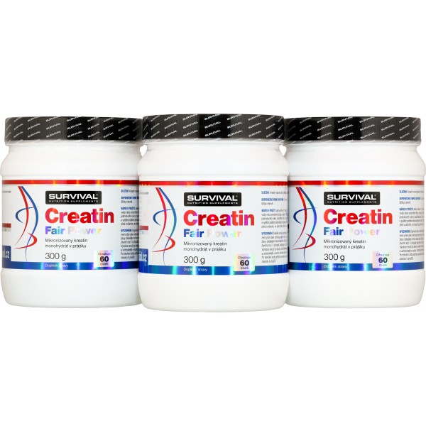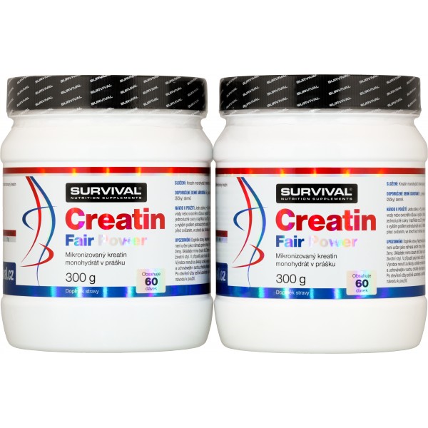 Creatin Fair Power (kreatin monohydrát) patří k nejosvědčenějším doplňkům sportovní výživy. Kreatin zvyšuje fyzickou výkonnost při po sobě jdoucích krátkodobých intervalech vysoce intenzivního fyzického výkonu – příznivého účinku se dosáhne při přívodu 3 g kreatinu denně. Creatin Fair Power společnosti Survival je vysoce čistou mikronizovanou formou kreatin monohydrátu bez obsahu jakýchkoliv jiných přísad. Mikronizovaná forma umožní snadnou přípravu, rychlou rozpustnost a maximální využitelnost v lidském organismu. Balení Creatin Fair Power společnosti Survival vystačí při ideálním doporučeném dávkování přesně na jeden 30denní cyklus užívání. Kvalitu Creatin Fair Power garantuje majitel trenérské školy Ronnie.cz a vyhledávaný osobní trenér vrcholových sportovců Pavel Provázek.