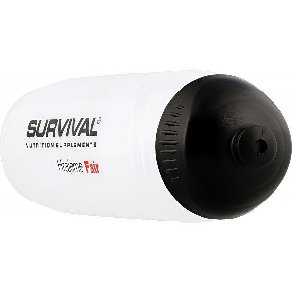 750 ml. Po straně má rysky objemu pro snadné zjištění množství nápoje uvnitř. Černé šroubovací víčko s černým posuvným náústkem. Bez hubice. Láhev je bílé/transparentní barvy, na sobě má logo Survival a nápisy Hrajeme Fair v černo-červeném provedení. Stupnice je uvedena jak v jednotkách ml, tak oz.