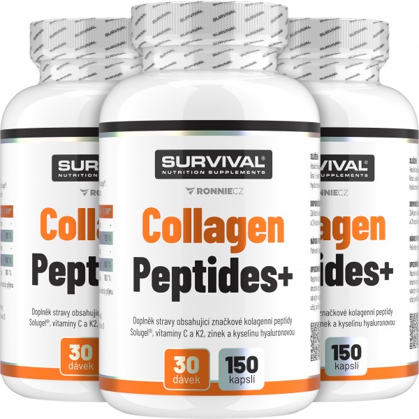 Doplněk stravy obsahující značkové kolagenní peptidy Solugel®, vitamíny C a K2, zinek a kyselinu hyaluronovou v kapslích. Kombinace účinných látek napomáhá ke správné tvorbě kolagenu, zlepšuje vzhled pokožky a vlasů, přispívá ke správnému fungování imunitního systému a tím zlepšuje odolnost organismu. Kolagen se vyskytuje v naší kůži, šlachách, kostech a vazivu, proto se Collagen Peptides+ postará především o pružnost, a to jak pokožky, tak pojivových tkání, podporuje správnou funkci kloubů a přispívá k ochraně buněk před oxidativním stresem. Kyselina hyaluronová pomáhá udržovat pokožku hebkou a dlouhodobě hydratovanou. Vitamín K2 je obsažen v nejlepší možné formě MK-7.
